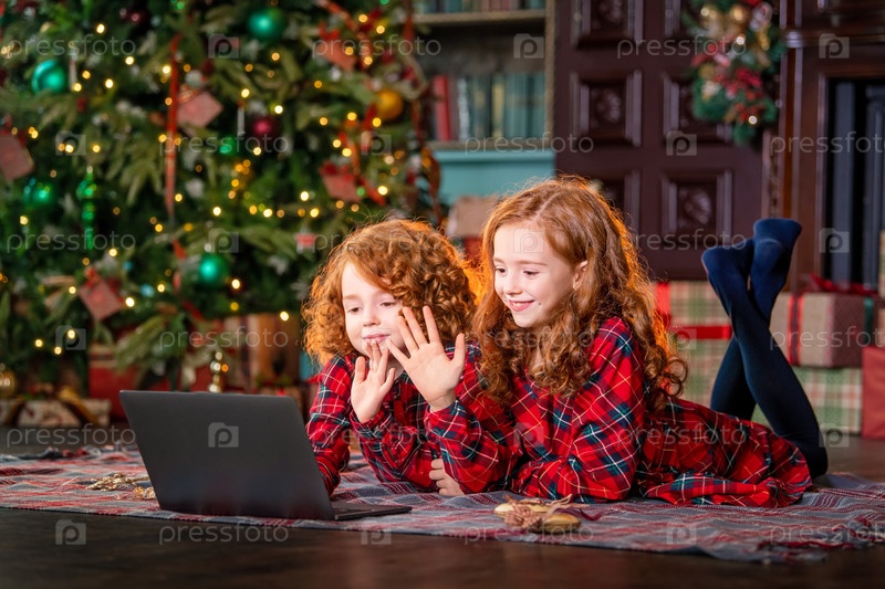 Веселые рыжеволосые дети рядом с елкой и подарками общаются онлайн через ноутбук