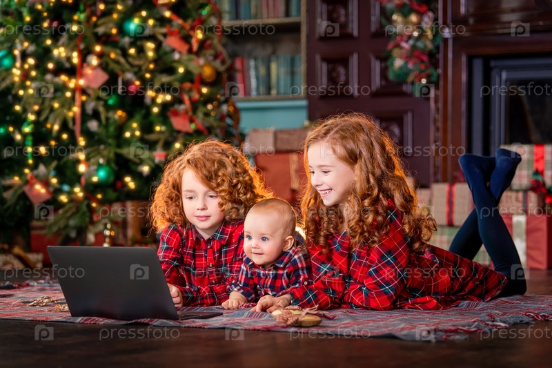 Веселые рыжеволосые дети рядом с елкой и подарками общаются онлайн через ноутбук
