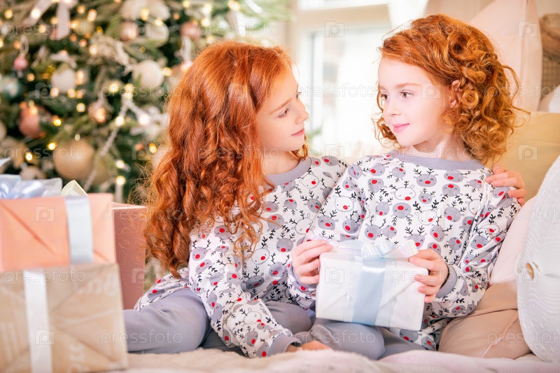 Рыжеволосые девушки в пижамах на кровати рассматривают коробки с рождественскими подарками на фоне елки