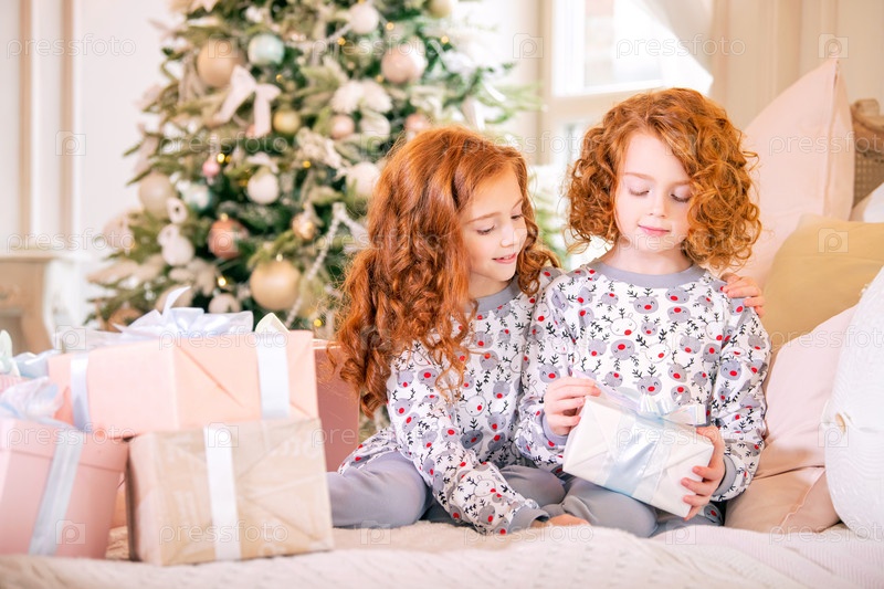 Рыжеволосые девушки в пижамах на кровати рассматривают коробки с рождественскими подарками на фоне елки