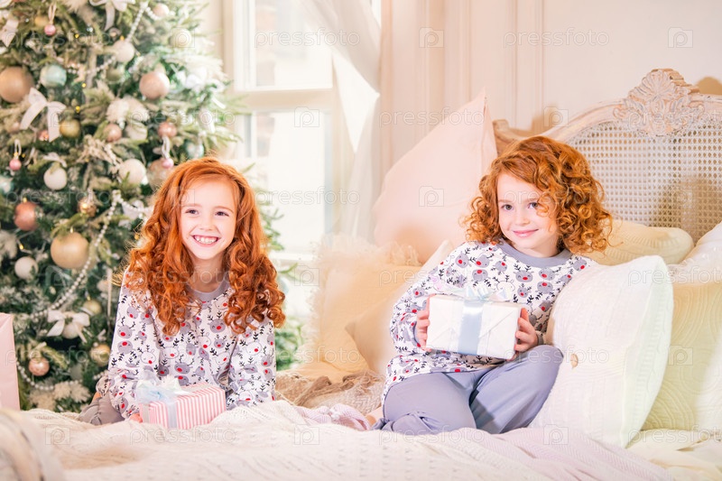 Рыжеволосые дети в пижамах сидят на кровати с подарками в руках на фоне елки