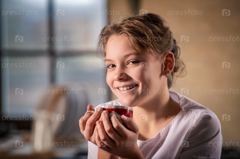 Девушка пьет чай на кухне дома вечером, за окном зима, падает снег, коробки с подарками на столе