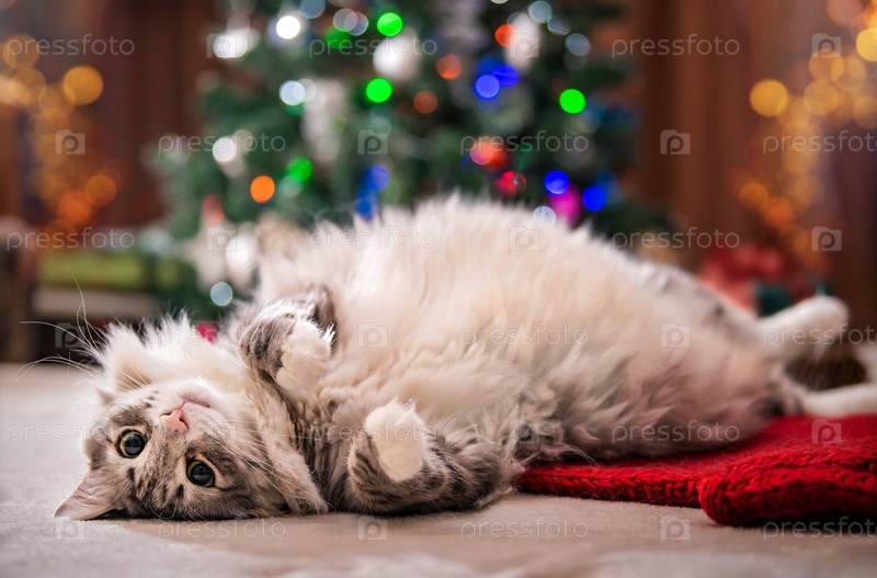 Рождественский кот. Портрет толстого пушистого кота рядом с подарочной коробкой на фоне елки и огней гирлянд