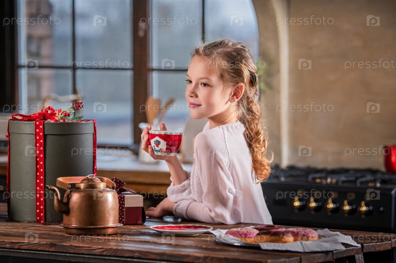 Девушка пьет чай на кухне дома вечером, за окном зима, падает снег, коробки с подарками на столе