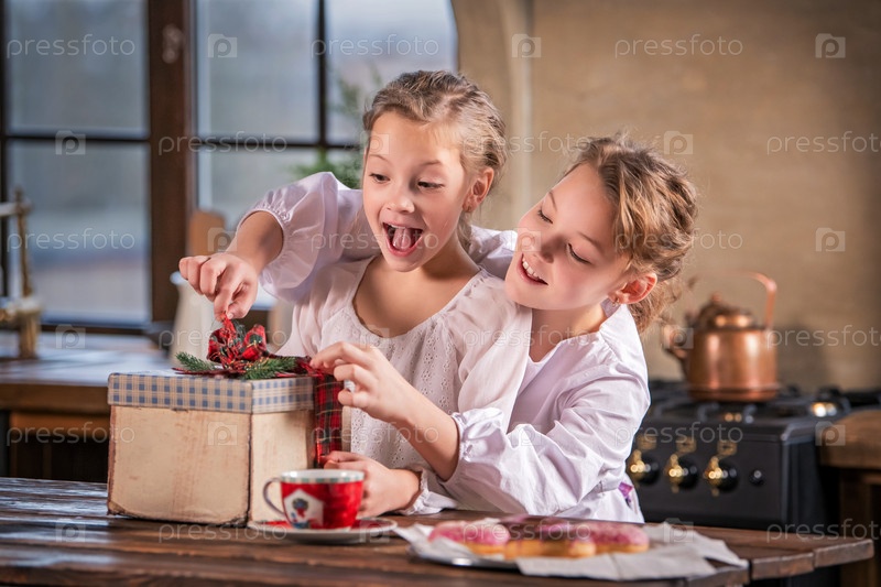 Две девушки за столом смеются, обнимаются и смотрят подарки