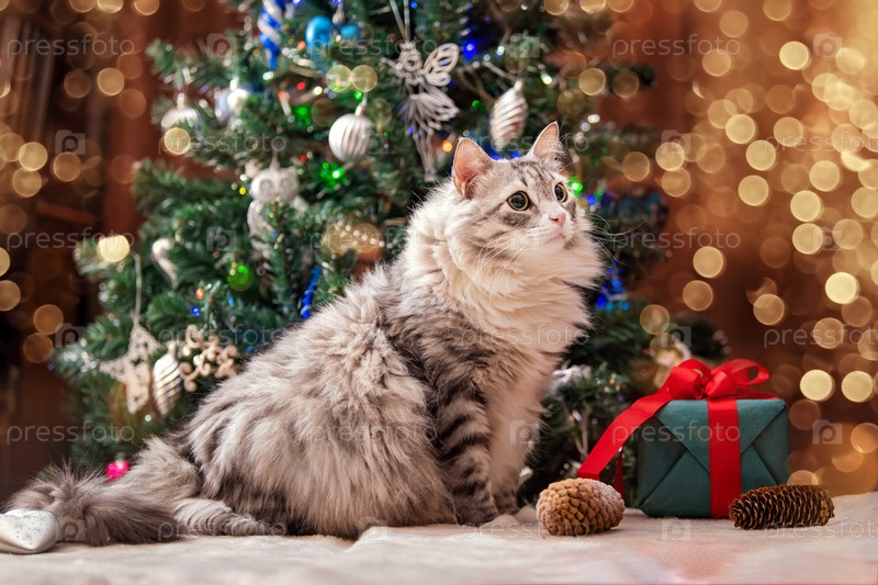 Рождественский кот. Портрет толстого пушистого кота рядом с подарочной коробкой на фоне елки и огней гирлянд