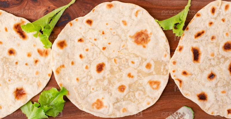 Три лепешки из тортильи на деревянной доске. Тонированное изображение