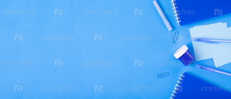 Вернуться к школьному плоскому фону. Набор канцелярских принадлежностей на синем. Веб-баннер с копией пространства. Монохромная композиция