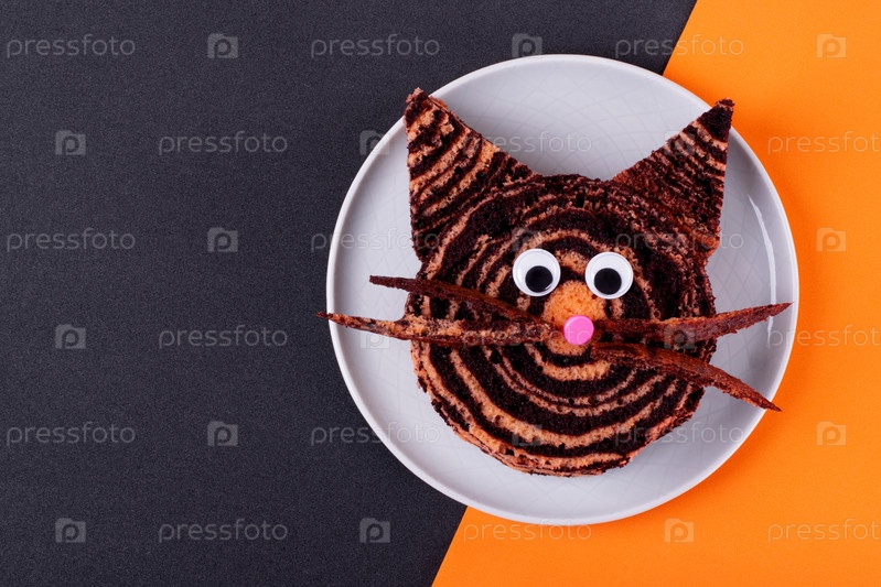 Торт с тигром на керамической тарелке на оранжевом и черном. Детская еда. Десерт