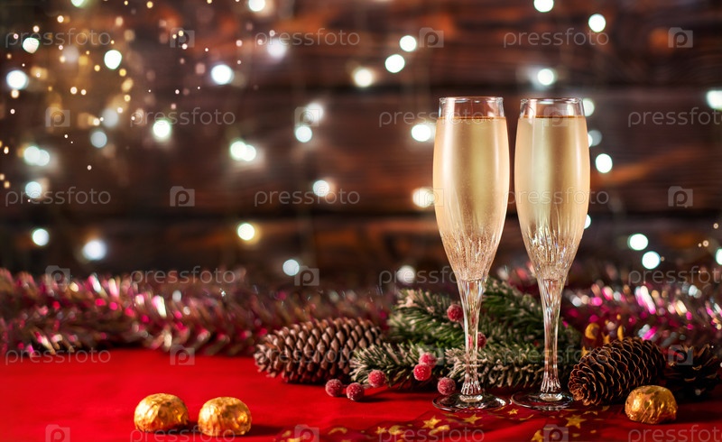 Два потных бокала шампанского, шоколада и рождественских украшений на красном столе рядом с горящими гирляндами