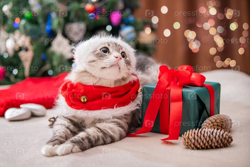 Рождественский кот. Портрет толстого пушистого кота рядом с подарочной коробкой на фоне елки и огней гирлянд