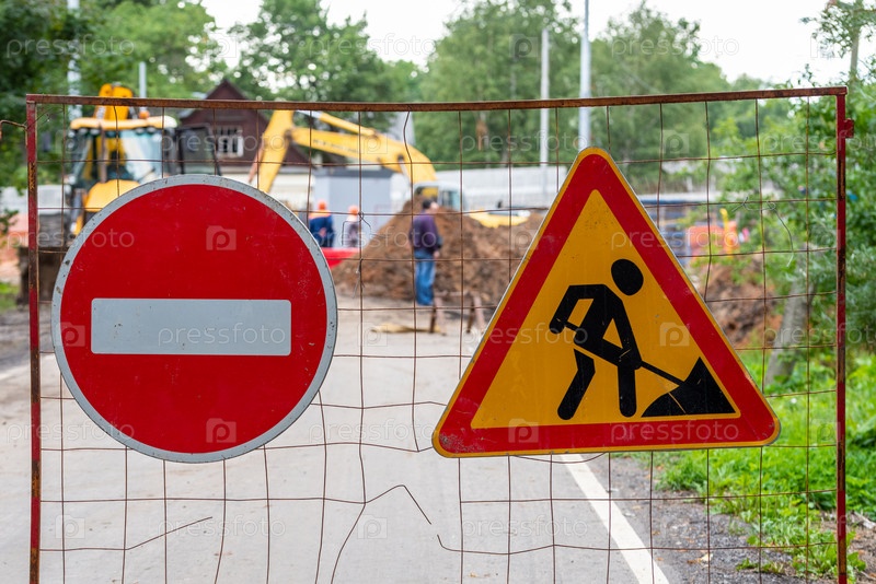 Дорожные знаки «проезд запрещен» и «дорожные работы» на расфокусированном фоне рабочих и строительной техники