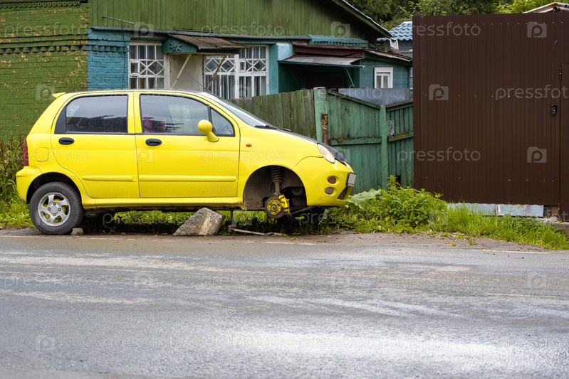 Желтый легковой автомобиль без переднего колеса на обочине проселочной дороги. Автомобиль без колеса на куче домкрата и камня