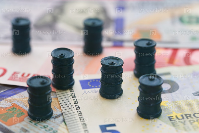 Бочки с избирательным фокусом на размытых купюрах доллара и евро…