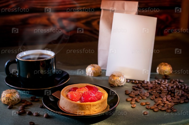 Завтрак из клубничного торта, ароматного кофе и шоколадных конфет. На зеленой скатерти на столе из крафтового пакета проснулись кофейные зерна