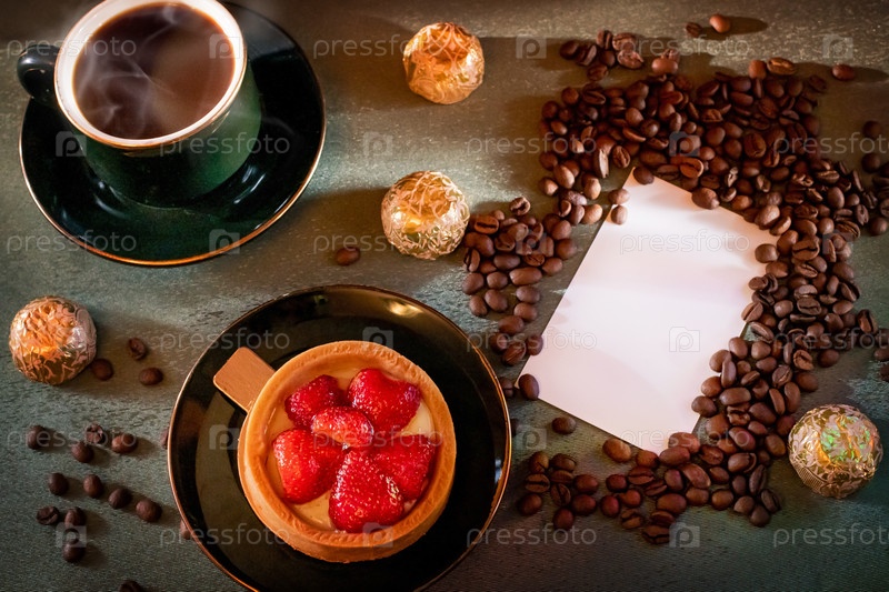 Завтрак из клубничного торта, ароматного кофе и шоколадных конфет. На зеленой скатерти на столе из крафтового пакета проснулись кофейные зерна