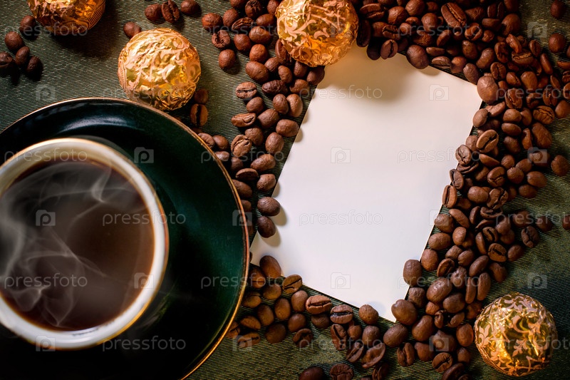 Чашка черного горячего ароматного кофе на столе, шоколад, кофейные зерна разбросаны вокруг, мокап