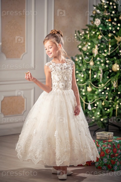 Портрет девушки в красивом платье на фоне елки