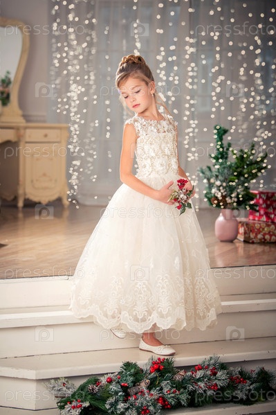 Портрет девушки в элегантном платье на фоне гирлянд в размытом фокусе
