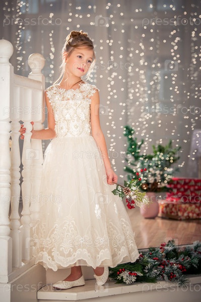Портрет девушки в элегантном платье на фоне гирлянд в размытом фокусе