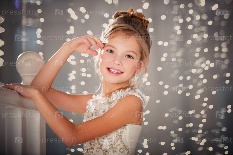 Портрет девушки в элегантном платье на фоне гирлянд в размытом фокусе