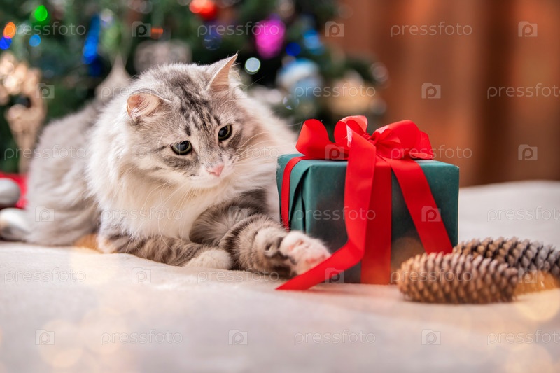 Рождественский кот. Портрет толстого пушистого кота рядом с подарочной коробкой на фоне елки и огней гирлянд
