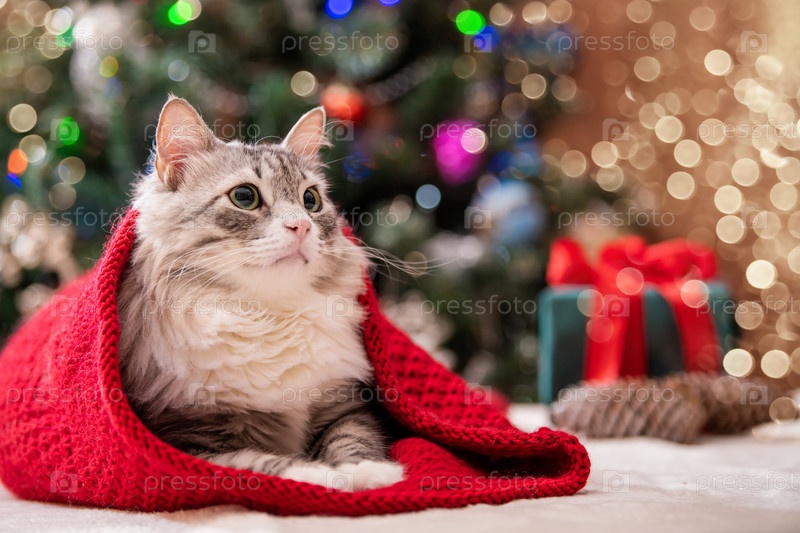 Рождественский кот. Портрет толстого пушистого кота рядом с подарочной коробкой на фоне елки и огней гирлянд