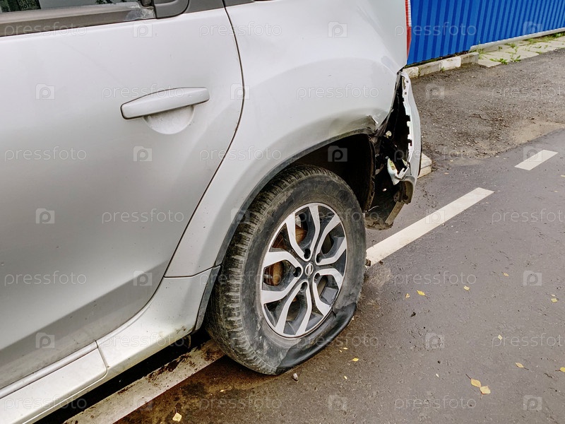 Фрагмент машины на обочине. Спущенная шина и сломанный бампер