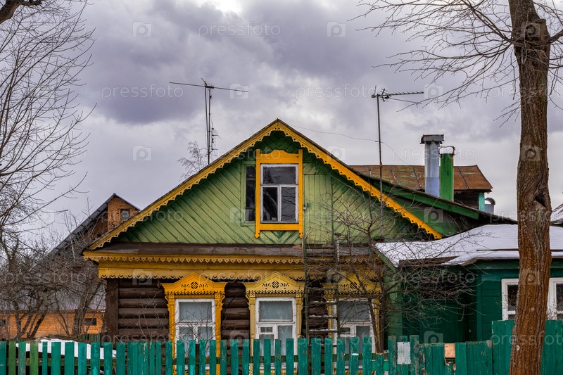 Фрагмент старого красочного русского дома в пригороде на фоне серого неба и грозовых туч