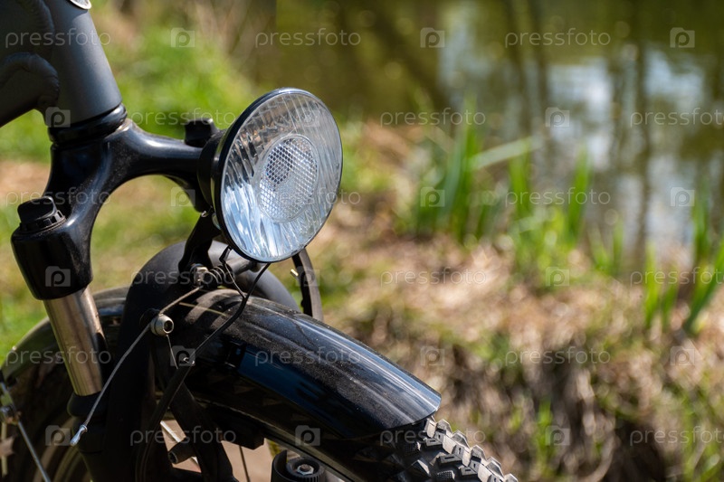 Крупный план передней части велосипеда с фарой на размытом фоне травы и пруда