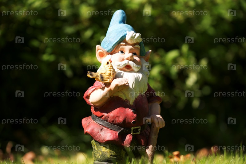 Игрушечный садовый гном на размытом фоне природы. Крупный план…