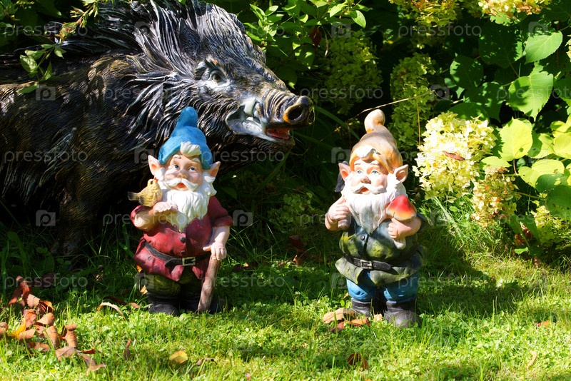 Игрушечные садовые гномы и кабан на размытом фоне…