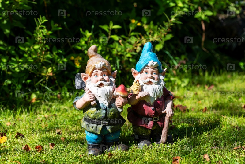 Два игрушечных садовых гнома на солнечной лужайке. Выборочный фокус
