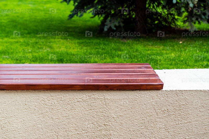 Крупный план скамейки. Городская скамейка из дерева на цементной основе. Место для надписи или дизайна