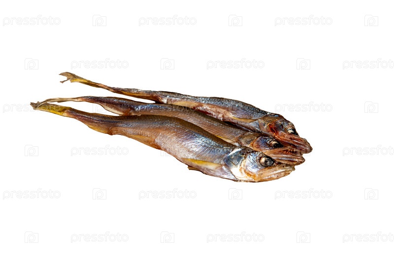 Копченая рыба на белом фоне. Мойва. Закуска к пиву. Выборочный фокус. Место для надписи или дизайна