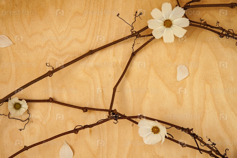 Белые цветы с темной лозой на деревянном фоне. Концепция проста