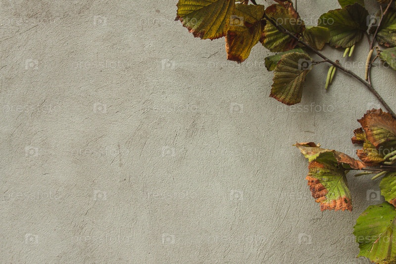Вид сверху на сухие цветы и листья на сером бетонном фоне. Копипространство. Концепция осенней простоты