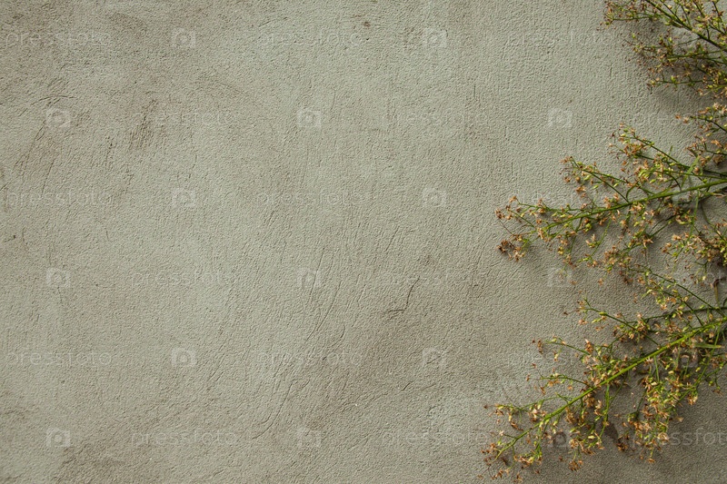 Вид сверху на сухие цветы и листья на сером бетонном фоне. Копипространство. Концепция осенней простоты