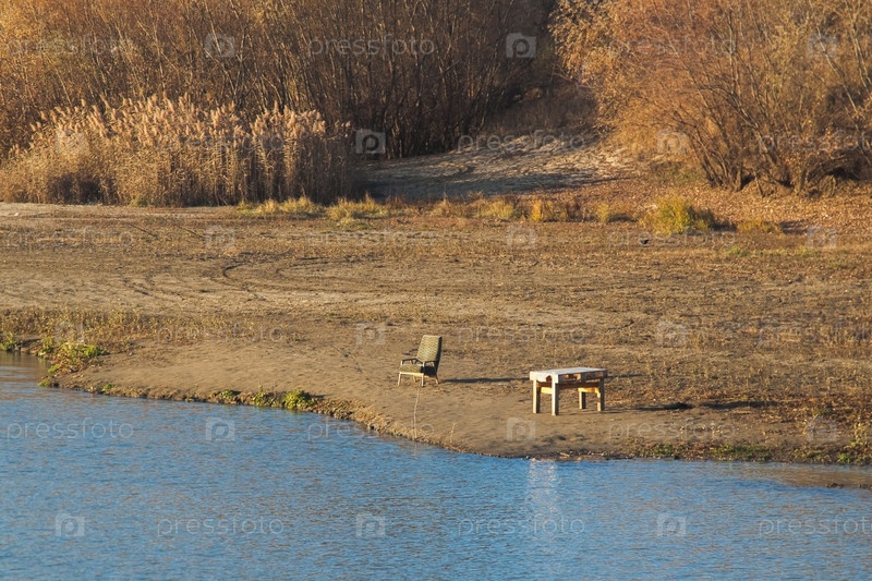 Стул и стол на диких берегах реки. Оборудован местом для рыбалки