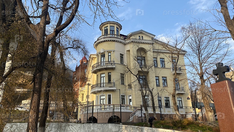 Владивосток, Россия - 18 ноября 2021 г.: Городской пейзаж с видом на здание Художественного колледжа