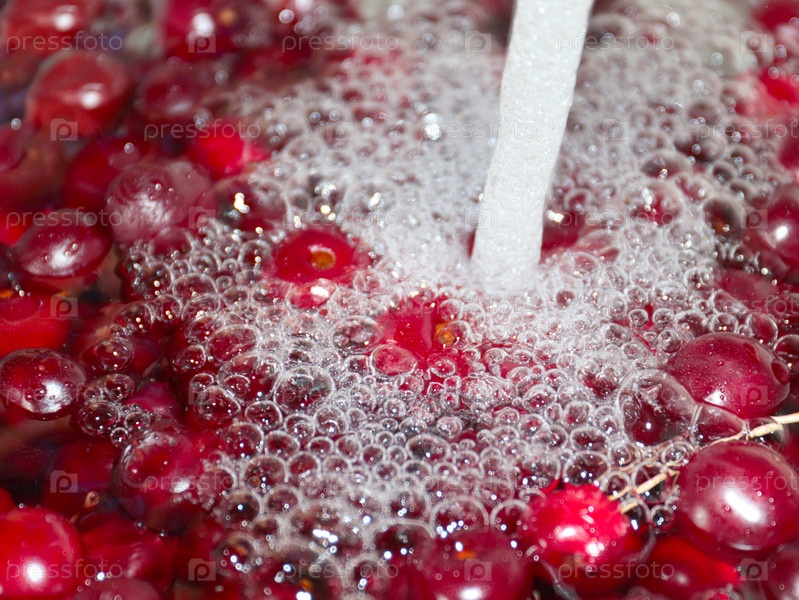 Поток чистой прозрачной воды и букет красных спелых вишен