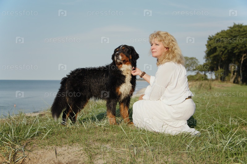 Собака и женщина сидят