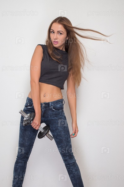 Девушка тренируется с гантелями
