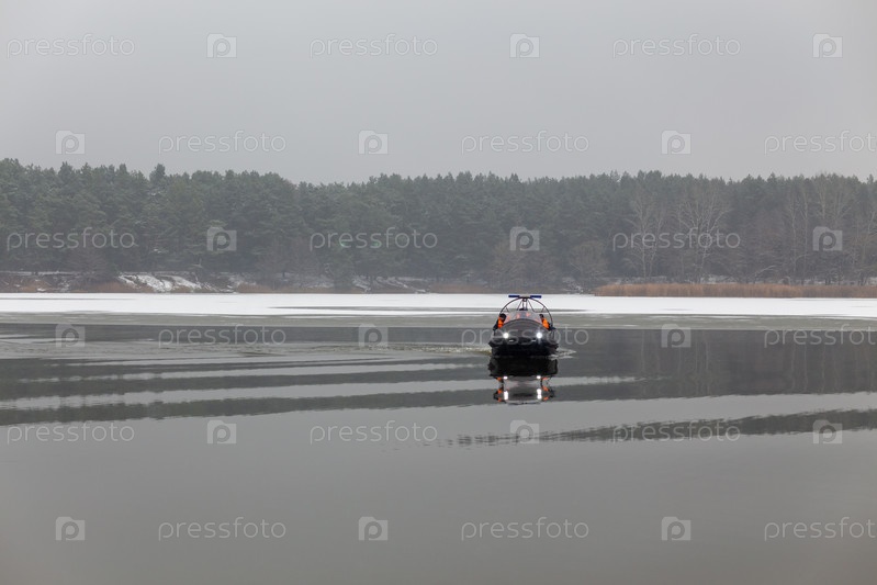 Спасательная команда плывет на воздушной подушке, чтобы спасти рыбаков на замерзшем озере, реке или море. Лодка может одинаково двигаться по воде, по льду и даже по суше