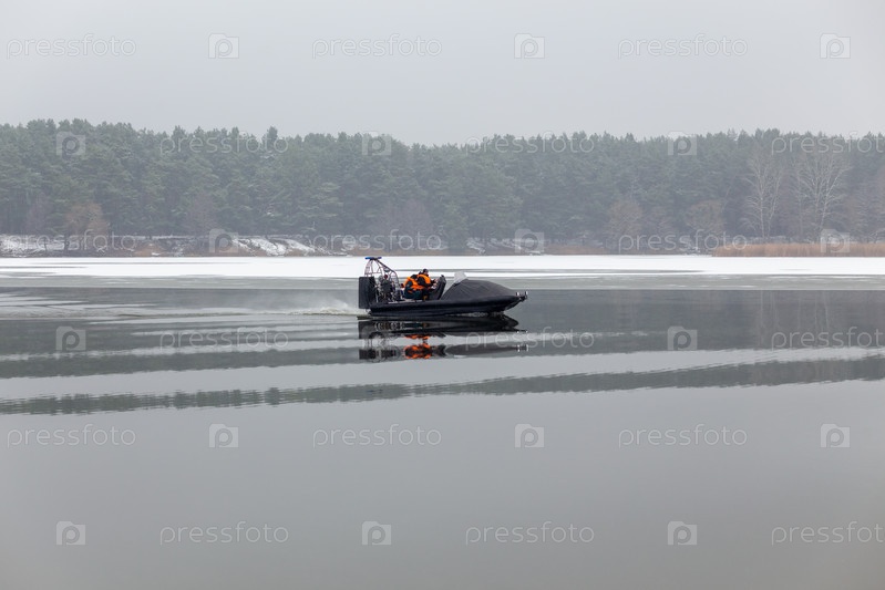 Спасательная команда плывет на воздушной подушке, чтобы спасти рыбаков на замерзшем озере, реке или море. Лодка может одинаково двигаться по воде, по льду и даже по суше