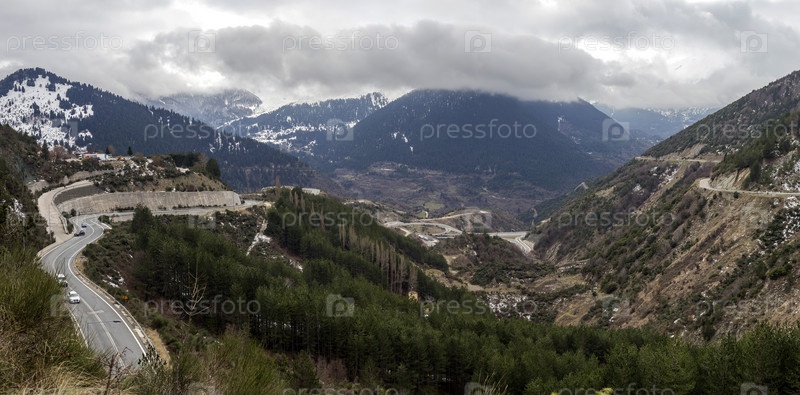 Зима в горах (район Эпира, Греция) и проселочная дорога в зимний день