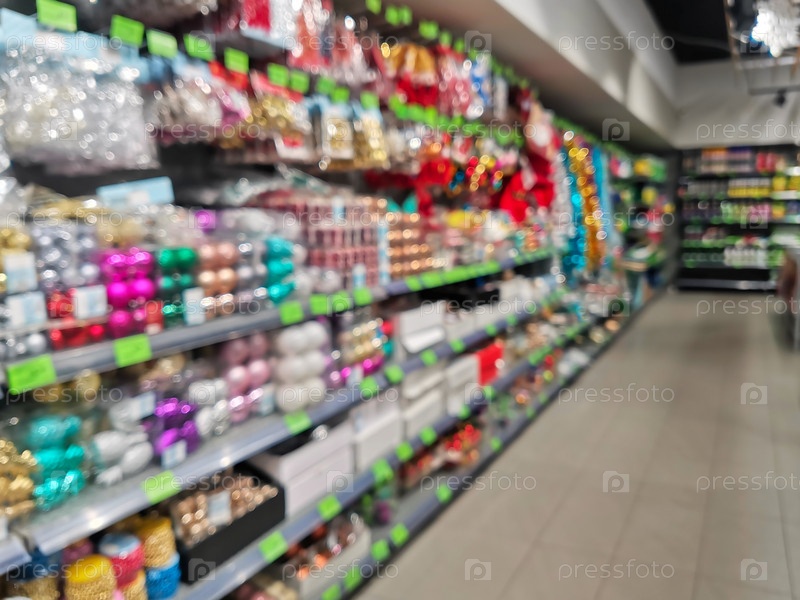 Размытый рождественский супермаркет. Продажа праздничных рождественских аксессуаров в розничном магазине. Размытый фон в магазине. Выборочный фокус