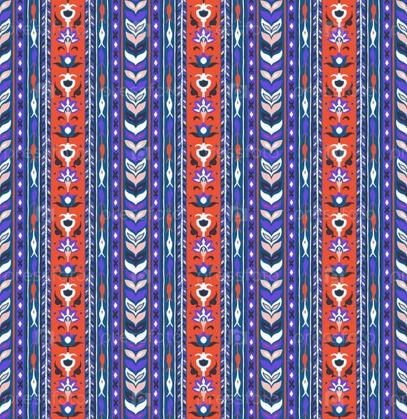 Геометрический дамасский орнамент. Икат границы. Этническая вышивка с листьями и монограммами. Племенная векторная текстура. Бесшовный народный узор в ацтекском стиле. Индийский, скандинавский, цыганский, мексиканский, африканский ковер