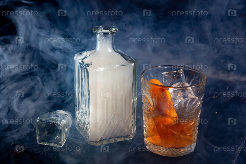 Окутанный дымом виски стеклянный графин с дымом и стакан виски со льдом и апельсиновой коркой на грифельной тарелке