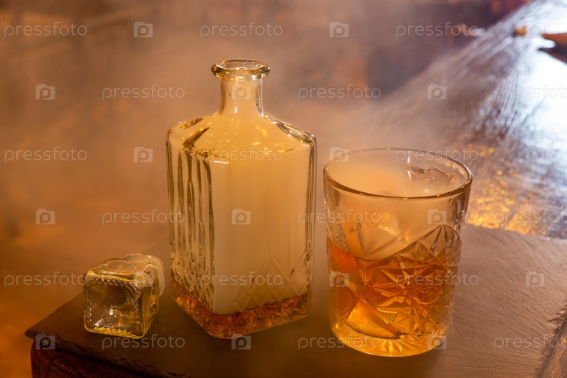Окутанный дымом виски стеклянный графин с дымом и стакан виски со льдом и апельсиновой коркой на грифельной тарелке